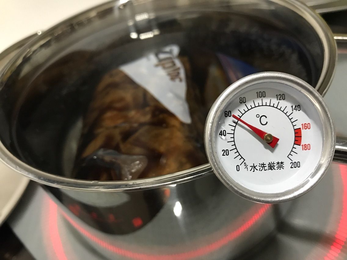 空気を綺麗に抜き取りジップをロック。60℃から64℃の温度で3時間。