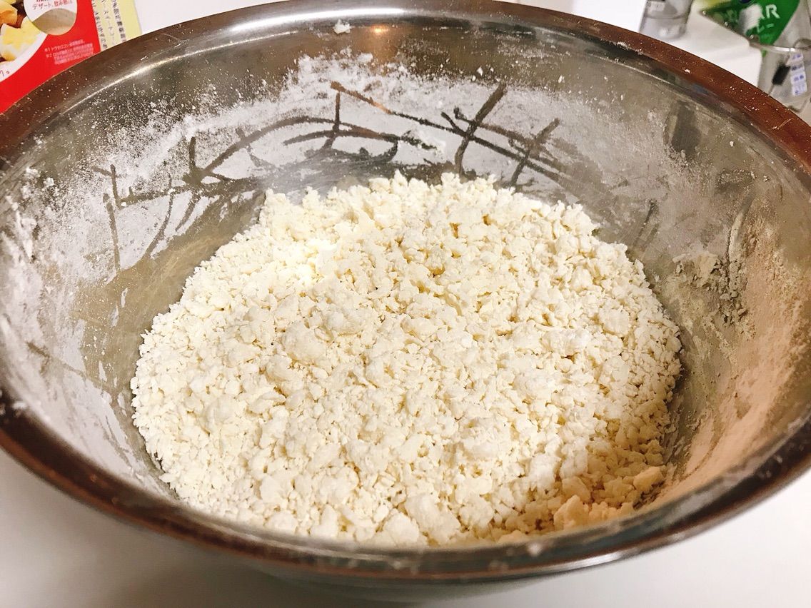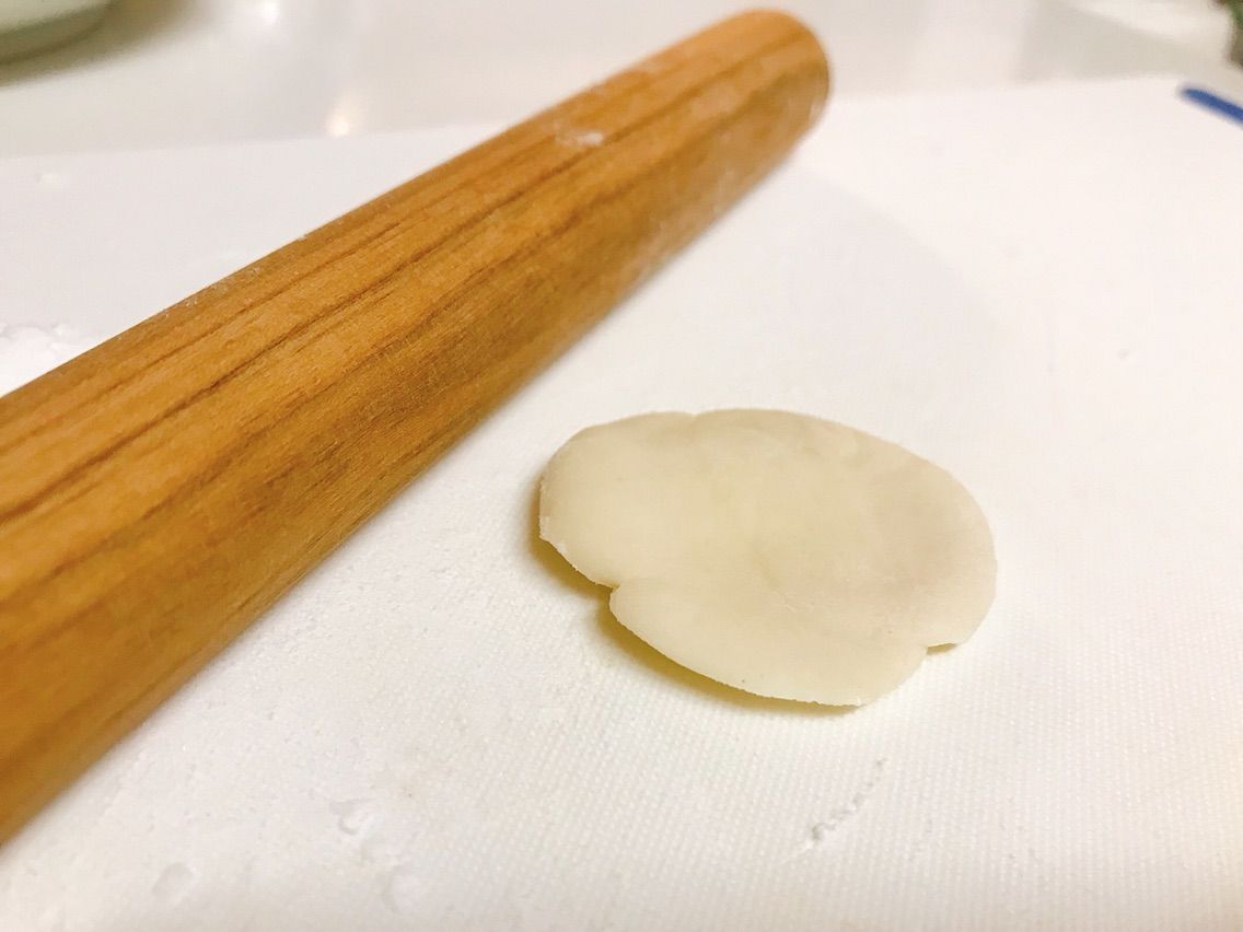 カットした玉を掌で円状になるよう丁寧に伸ばす。ムギュ。