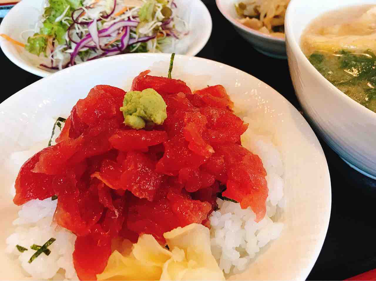本日のオススメ(マグロ中落ち丼、魚汁、小鉢、サラダ)850円